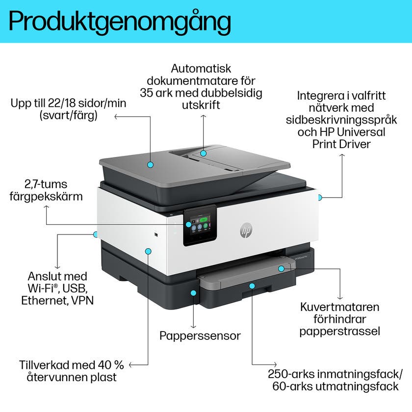 Bläckstråleskrivaren OfficeJet Pro 9120b All-in-one från HP är enkelt att driftsätta, integrera och konfigurera på flera olika platser. Integrera sömlöst över alla nätverk med stöd för HP Universal Print Driver och sidbeskrivningsspråk. Smidigt att anpassa och hantera skrivarparken efter olika behov med enkel fjärrstyrning och förbättrad funktionskontroll. Skrivaren är utrustad med ett inmatningsfack för 250 ark och är alltid redo för stora volymer. Pålitligt wifi – dual-band och självläkande (automatisk återanslutning).