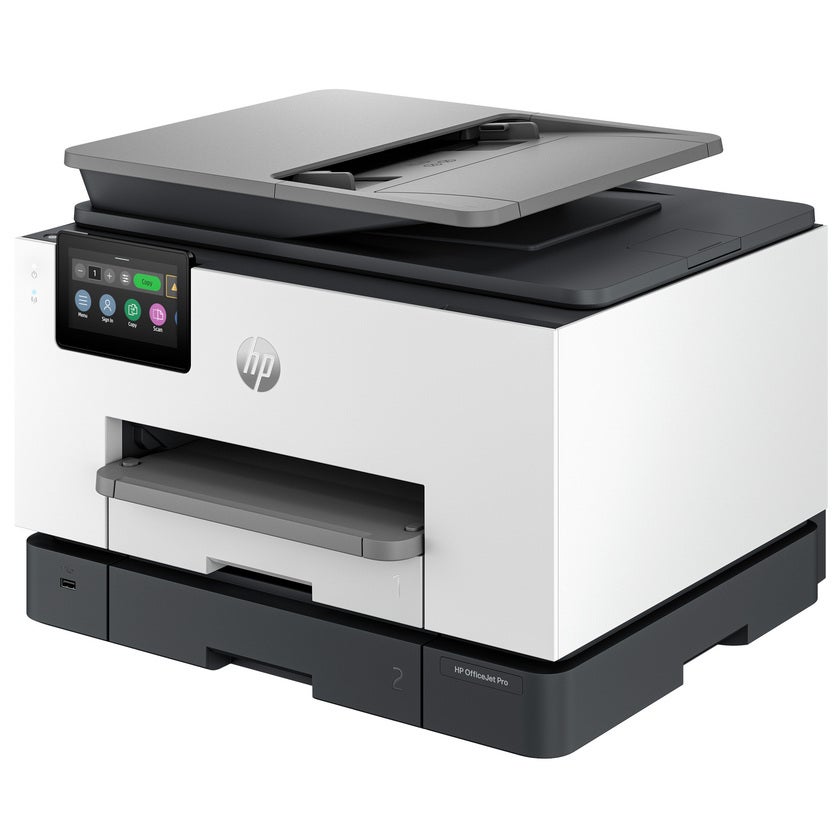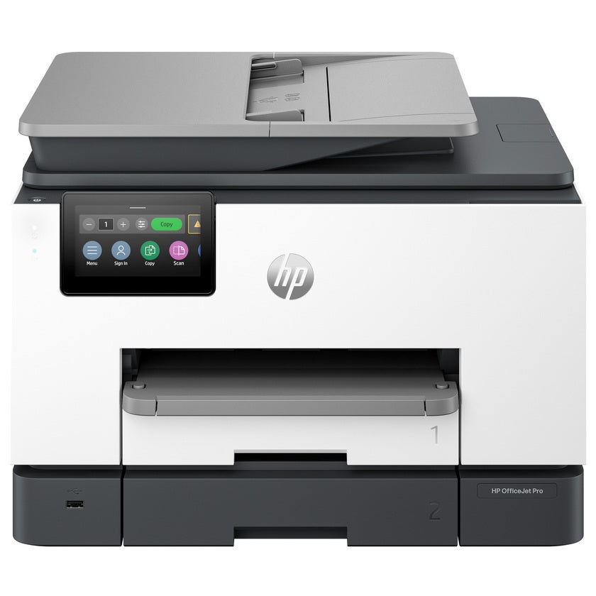 Bläckstråleskrivaren OfficeJet Pro 9130b All-in-One från HP är utrustad med två inmatningsfack för 250 ark är alltid redo för stora volymer. Spara tid med en dokumentmatare som möjliggör dubbelsidig skanning i ett svep. Använd skrivaren helt sömlöst med en 4,3 tum stor färgpekskärm och ett telefonliknande användargränssnitt. Skrivaren klarar av upp till 25 sid/min (PPM). Enkel att driftsätta, integrera och konfigurera på flera olika platser. Integrera sömlöst över alla nätverk med stöd för HP Universal Print Driver och sidbeskrivningsspråk. Förbli uppkopplad med pålitliga Wi-Fi® – dual-band och självläkande (återansluter automatiskt).