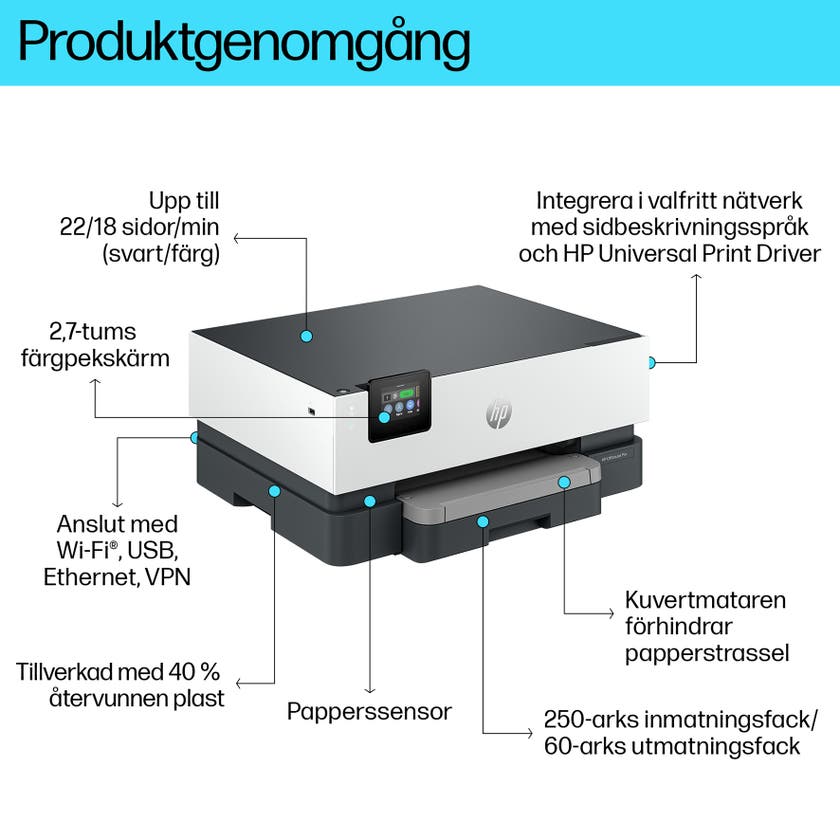 Bläckstråleskrivaren OfficeJet Pro 9110b från HP är enkelt att driftsätta, integrera och konfigurera på flera olika platser. Integrera sömlöst över alla nätverk med stöd för HP Universal Print Driver och sidbeskrivningsspråk. Smidigt att anpassa och hantera skrivarparken efter olika behov med enkel fjärrstyrning och förbättrad funktionskontroll. Skrivaren är utrustad med ett inmatningsfack för 250 ark och är alltid redo för stora volymer. Pålitligt wifi – dual-band och självläkande (automatisk återanslutning).