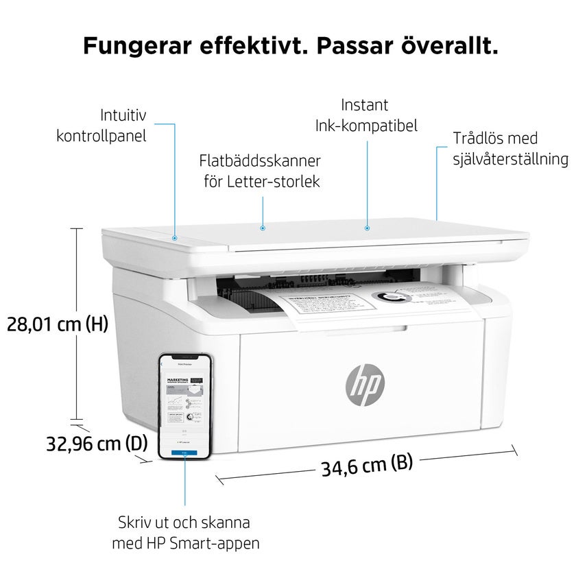 HP LaserJet MFP M140w är en effektiv multifunktionsskrivare i hög kvalitet. Kopiera enkelt båda sidorna av en ID-handling, eller andra små dokument, till samma sida av ett pappersark. Enkel hantering av uppgifter och maximal nytta från en och samma enhet – skriv ut, skanna och kopiera. Få snabba utskrifter med denna nätta och kompakta laserskrivare som passar nästa varsomhelst. Många smarta funktioner via den tidsbesparande HP Smart-appen. Räkna med laserutskrifter av professionell kvalitet och sömlös installation. Intuitiv och enkel att använda.