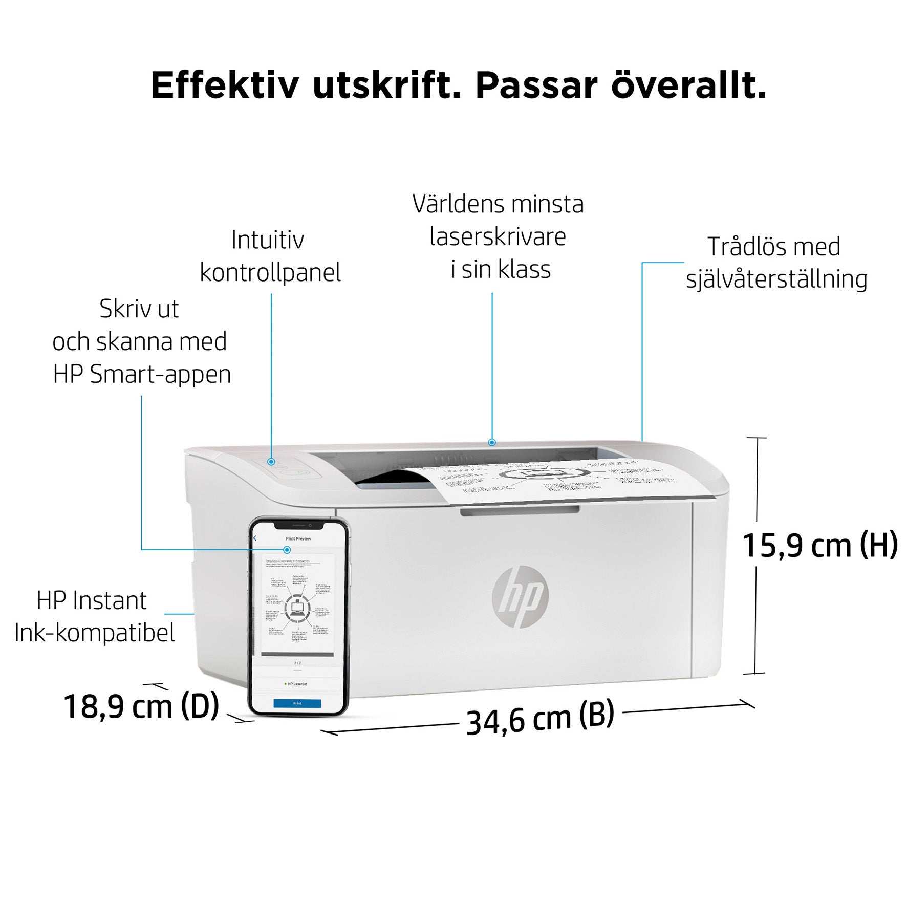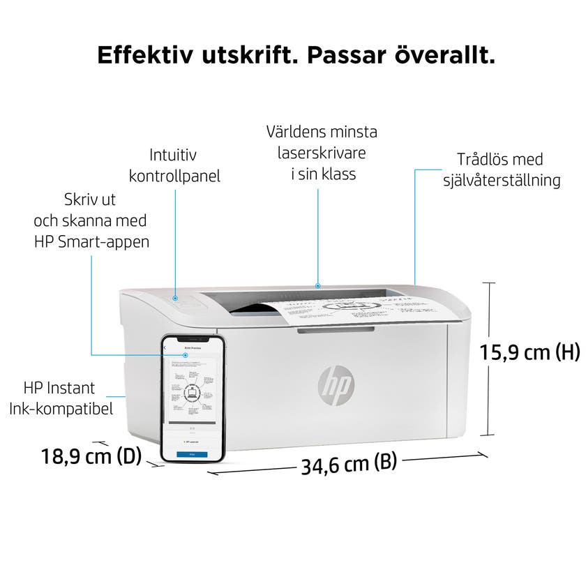 Laserskrivaren LaserJet M110w är HP:s minsta i sin klass. Utformad att vara effektiv. Med en utskriftshastighet på upp till 20 sid/min i A4 så maximeras drifttiden. Skrivaren har trådlös anslutning med självåterställning så att ni kan förbli anslutna. Smart och elegant design – enkel och intuitiv att använda.