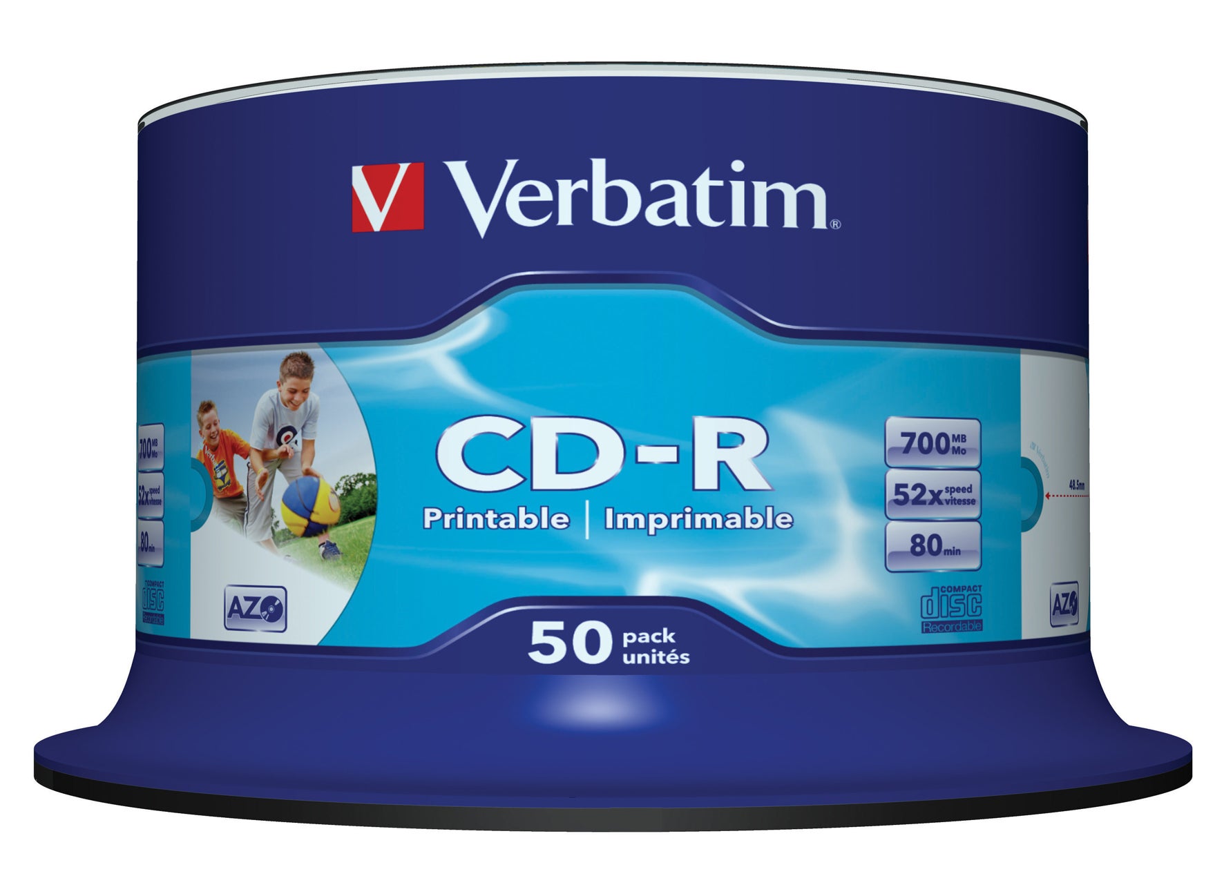 Verbatim CD-R Printabel har en kapacitet på 700MB och 52x brännhastighet. Ytskikt med vit skrivbar yta (23-118 mm) som det går att skriva på med bläckstråleskrivare eller CD/DVD penna.